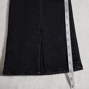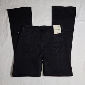A slit hem and center seaming put a unique spin on this sleek baby bootcut jean offered in washed-black premium stretch denim. Contoured waistband fits securely at the natural waist, smoothing and slimming the figure, while premium stretch denim hugs hip, thigh, and knee before releasing into a baby bootcut hem detailed with center front slit. Includes four-pocket construction and zip fly closure with tonal button.