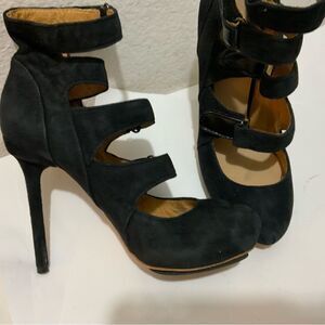 New L.A.M.B Heels Platform Strappy Buckles Suede Black Gwen Stefani New