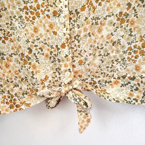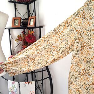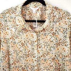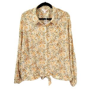 NWT New with tags! LC LAUREN CONRAD Floral Long Sleeve Blouse XXL Women's Button Up Shirt Flower Print with Accent Gold Metallic Flowers and tie waist. White with peach, gold, and green multicolor. Lightweight with elastic sleeve hem. 52" chest, 27" shoulder to front hem. Compare to $50 new!