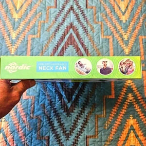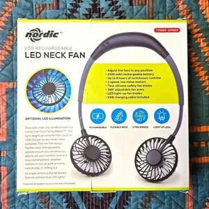 New,unopened box Nordic LED Neck Fan. USB rechargeable. Flexible. 3 speed. Lights up