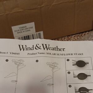 Wind & Weather Large LED Solar Sunflower Stake. New In Box. Comes With 1 Rechargeable AAA Battery. The Panel Charges With 12 Hours Of Direct Sunlight And Will Last For 6 To 8 Hours.