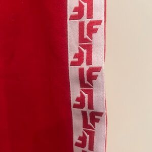 Super cool red LF sweatpants featuring a bold branded stripe down each side. Perfect blend of streetwear and casual chic. Great for lounging, errands, or dressing up with a crop top and sneakers. Comfy fit, stylish look – a wardrobe essential!