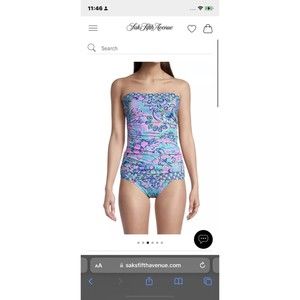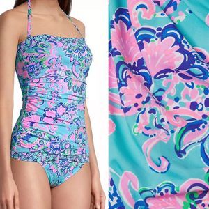 New LILLY PULITZER 0 JUSTINA TANKINI BLUE HORIZON JUNGLE SUNRISE Size 0 abstract print, cut in a strapless design and finished with flattering ruching. Straightneck Strapless Pullover style 75% nylon/25% spandex NEW WITH TAGS- missing neck strap