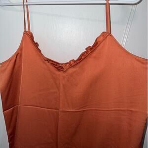 Loft Outlet tank top cami style, new with tags still attached, color is a burnt orange similar to photos, ruffle details around the top, thin spaghetti strap tank top, lightweight made of polyester, size medium womens