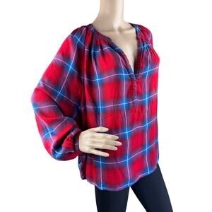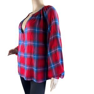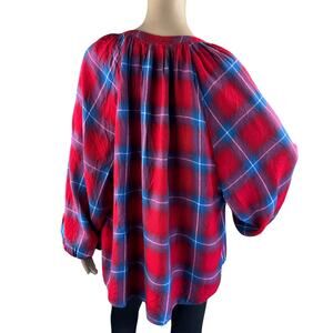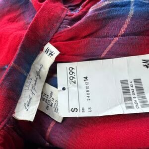 New L.O.G.G. H&M Women Red Blue Plaid V-Neck High Low Hem Bishop Sleeve Size 14