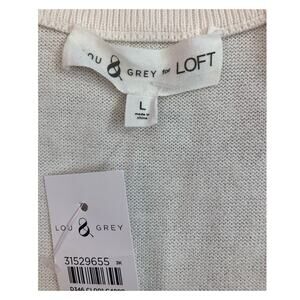 Lou & Grey for Loft Peaches Knit Sweater Tank in Large Cream, a delightful addition to your wardrobe. This brand collaboration brings you a charming sweater tank adorned with a playful peach print on the front, adding a touch of whimsy to your style. This top is a comfy, relaxed fit in size large and is new with tags, making it perfect for any occasion.
