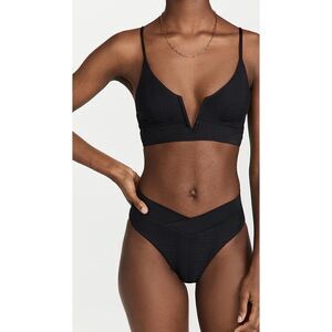 New L*SPACE black siren top and court bottom bikini. A retro-inspired sculptural silhouette makes the Siren top a must-have for any beach bombshell. This pullover pointelle ribbed top features a plunging V-wire front and V-detail back. Removable pads and adjustable straps let you customize your look.