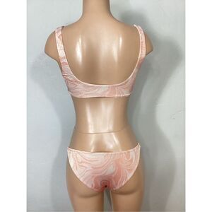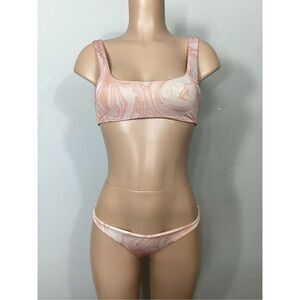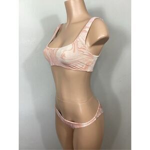 New. L*SPACE bikini set. Vivacious yet simple, the Lizzie Top fits our vibe without any distracting frills. The stretchy material feels smooth against our skin as it follows our every move, while the low square back and front sit discreetly under our top for beachside sips. Beautiful swirl pattern in pink, cream, peach with a dusting of gold shimmer.