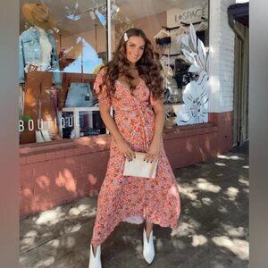 Perfect for warm summer nights, this is a high-low wrap dress featuring romantic ruched shoulders, flowy short sleeves, and a flattering, functional tie waist. Can be worn either on or off the shoulder.