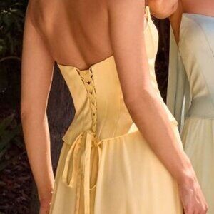 Crafted from flowing Chiffon, this elegant long A-line gown features a structured boned bodice that provides flawless sculpting and a timeless strapless scoop neckline that beautifully highlights the décolletage. The flattering A-line silhouette flows gracefully to the floor, ensuring beautiful movement and an elegant drape for any occasion. The adjustable lace-up back ensures a custom, perfectly cinched fit, and the included matching scarf adds a final touch of customizable sophistication to this stunning piece.