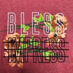 NEW - LULAROE Classic T / Graphic Tee in a red-pink with Bless Impress over a printed floral design in coral and green. Short sleeve scoopneck tee with LuLaRoe on the sleeve. Size Small, fits sizes 6-8. NWOT.