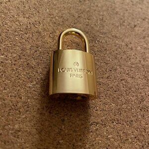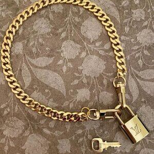 Authentic new gold tone LV Louis Vuitton lock attached to a new unbranded 16 inch curb link chain choker necklace (chain is not Louis Vuitton). It opens and closes with either end clasp attached to the lock. Includes two matching Louis Vuitton keys that open the lock.