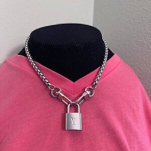Authentic new LV Louis Vuitton lock attached to an unbranded silver tone 18 inch box link chain. The chain is new and not made by Louis Vuitton. Necklace opens and closes with either clasp attached to the lock. Includes two authentic keys that opens the lock. #louisvuitton