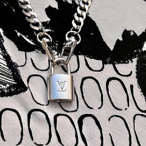 Authentic new LV Louis Vuitton lock attached to an unbranded silver tone 18 inch curb chain. The chain is new and not made by Louis Vuitton. Necklace opens and closes with either clasp attached to the lock. Includes two authentic keys that opens the lock. #louisvuitton