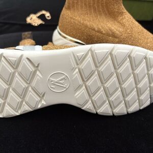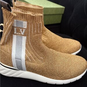 New LV gold knit high-top sneakers with white accents. Features a sleek design and comfortable fit. No box