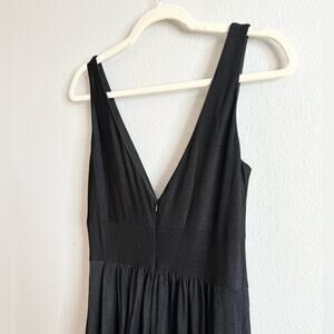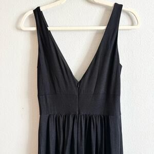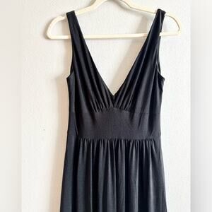 Simple and timeless jersey dress with empire waist and deep V neckline. Features a side leg slit and wide straps. Back zipper closure.