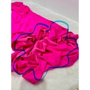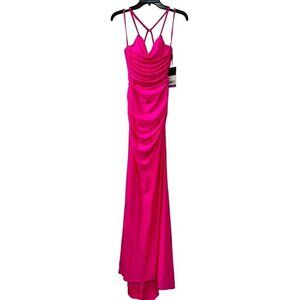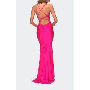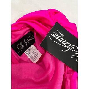 New La Femme Size 2 Plunging V-neck Ruched Sheath Prom Dress Neon Pink **Stains*