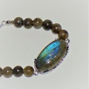 The 30mm x 15mm x 8mm cabochon is gorgeous, but I wasn't able to capture its subtle sparkles & striations. The round beads are 8mm. Both beads & center cabochon are Labradorite. Comes with "Made in India" tag.