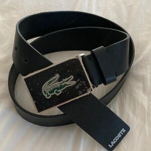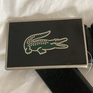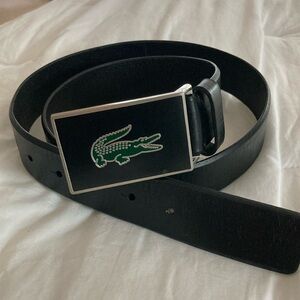 Must HAVE! “Lacoste” Men’s Full Grain Black Leather Belt with an unusual shiny black enamel buckle w/ silver trim, with the Iconic GREEN CROCODILE Logo on it! Belt strap is a generous 1 & 1/2 inches wide! A real unique belt ! A must have for the designer conscious!!!