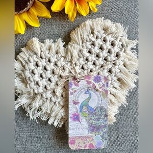 New Large 7” Handmade Woven Macrame Cream Color Heart Coasters Set of 2