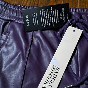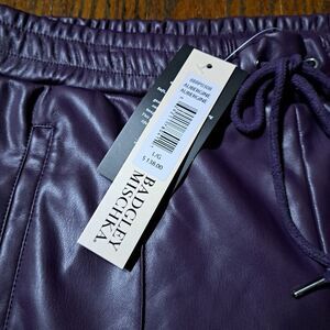 New With Tags Attached Women's Size Large Badgley Mischka Aubergine Purple Soft Faux Vegan Leather Elastic Drawstring Waist Softly Lined Pants with Pockets and Wide Legs