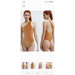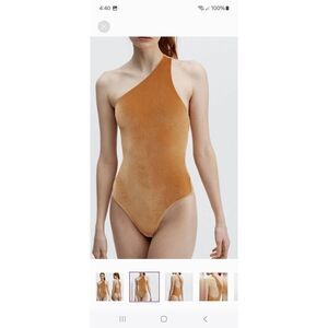 New Large Fabletics Light Honey Gigi Velour Thong Bodysuit One Shoulder NWT
