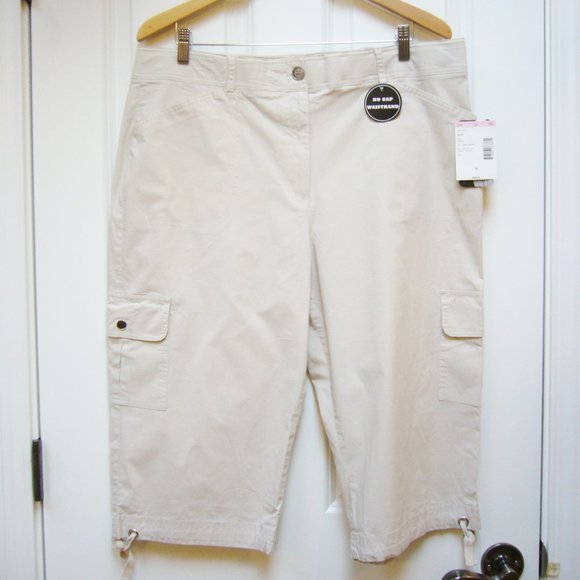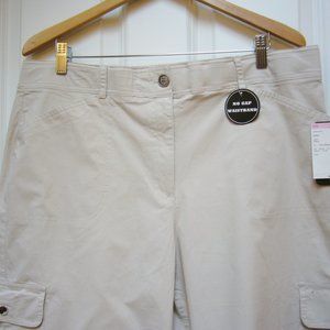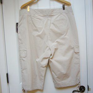 New with tags womens Laura Scott Capris, cargo style, no gap waistband, adjustable ties at bottom, khaki in color, size 18.
