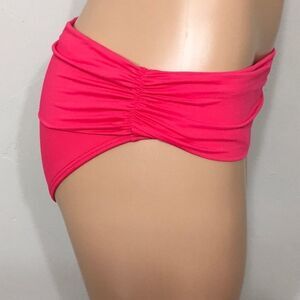This is one of my favorite bikinis! I love the versatility of it. You could adjust the band on the waist up high or down low depending on your liking. There is a large ruched flap that is very flattering and hides imperfections. The top has soft sliding formed cups and hold you in perfectly. They tie at the neck and back. Removable gold hardware. Love it