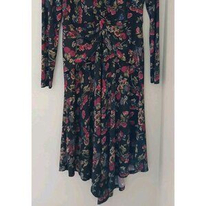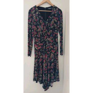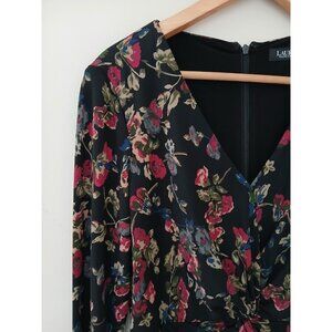 New Lauren Ralph Lauren Surplice Jersey Dress. Size 6. Black with a floral pattern. V neck. Asymmetrical hem (longer in the middle). Long sleeves. Work, career, wedding. New with tags. No flaws noted. Measures approximately 17" pit to pit, 40" shoulder to hem.