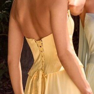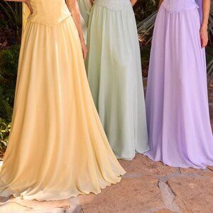 Crafted from flowing Chiffon, this elegant long A-line gown features a structured boned bodice that provides flawless sculpting and a timeless strapless scoop neckline that beautifully highlights the décolletage. The flattering A-line silhouette flows gracefully to the floor, ensuring beautiful movement and an elegant drape for any occasion. The adjustable lace-up back ensures a custom, perfectly cinched fit, and the included matching scarf adds a final touch of customizable sophistication to this stunning piece.