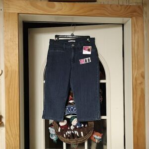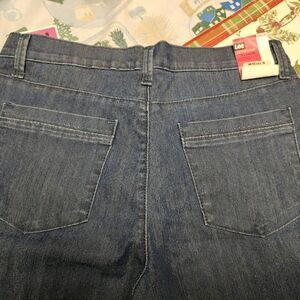New with tag Lee classic fit jean skimmers size women's 6 medium. They are instantly slimming have little sparkly beads on the top of the front and back pockets and bottom of the legs inseam 16 inches sits at the waist.