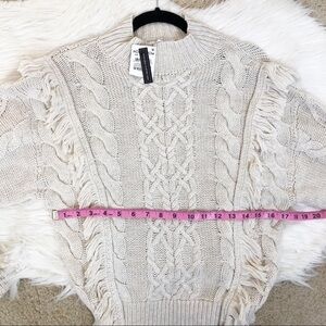Brand new with tags. Heavy knit cozy sweater with cable knit and fringe details. Total length from shoulder to hem approximately 24”. Please see photos for additional measurements, fabric content, and care. 💕