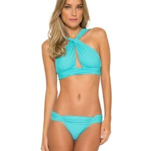 Lenny Niemeyer’s new ruched bikini bottom has a gathered waistband with ruching details, and a European cut. In Lenny Niemeyer's very soft Touch fabric. In a beautiful shade of turquoise aqua.