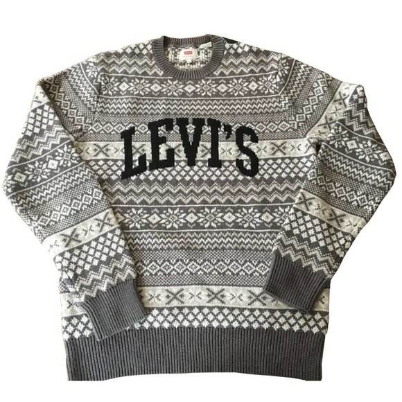 Brand new with tags, authentic Levi's brand gorgeous quality men's size crew neck pullover sweater made from 60% cotton 40% acrylic yarn so it's machine washable, all in a nice thick knit with a beautiful fairisle design in cream and gray with the large black Levi's name worked into the chest, and complete with solid gray ribbed neck and wrists and waist.