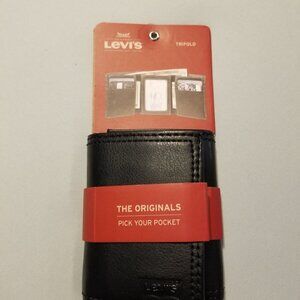 Never before used, men's tri-fold wallet by Levi's, made from all man-made materials, in its original packaging. Includes plenty of slots for credit cards, a clear window for your driver's license, and room for cash, pictured. Built to last!