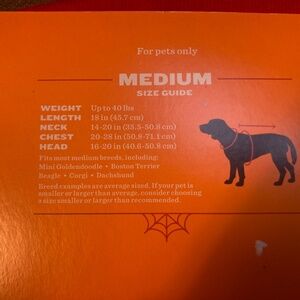 NEW Rainbow dog costume, medium. Made from lightweight fabric with adjustable velcro closure around waist for our friends who may be blessed with more girth. Press small button to turn on working lights. See picture of size chart.