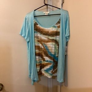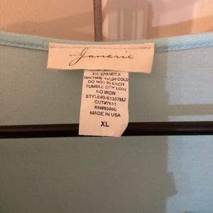 This Janeric blouse is beautiful! It is brand new, has never been worn and is a size XL. It still has the tag attached! It has an eyelash shell and has stunning blue, tan and white colors throughout. Would look great with slacks, jeans or a skirt.