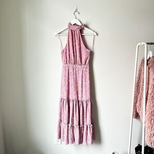 Revolve Likely Mona Floral Ruffle Midi Dress in Pink/Purple. A pretty floral printed midi dress features a halter tie neck, tiered flounce skirt for an effortless feminine style. Features sleeveless, side concealed zip closure, floral print, tiered panel design, woven construction, and flounced hem. New with tags. No holes, rips, or stains. Ours is a pet & smoke free home.