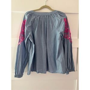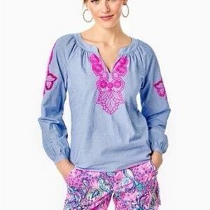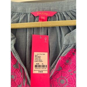 New Lilly Pulitzer Blue Chambray Hot Pink Amabella Embroidered Top