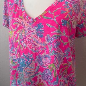 New Lilly Pulitzer Etta V-Neck Pink Isle Shirt Shell Me Something Good Size L