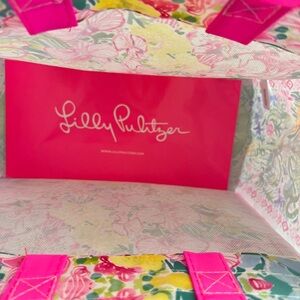 New - Lilly Pulitzer reusable tote. With Lilly printed bottom. Perfect as a gift bag, lunch tote, etc.! Size is 11 inches wide by 9 inches high with a handle drop of 4 inches.
