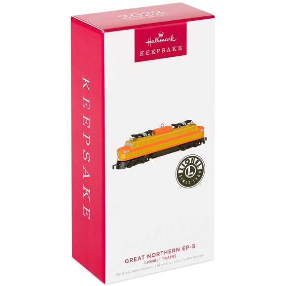Brand new in box and never opened, hard-to-find premium quality Hallmark Keepsake Christmas ornament only made in 2022, titled "Great Northern EP-5" it depicts the double-headed locomotive engine a rare special edition gold & orange, made of diecast metal with incredible detail including wheels that turn, making this #27 in the Lionel Trains series of ornaments.