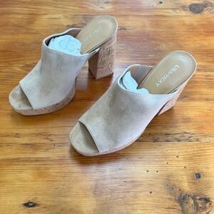Step out in style with these elegant tan/ camel suede platform sandals.