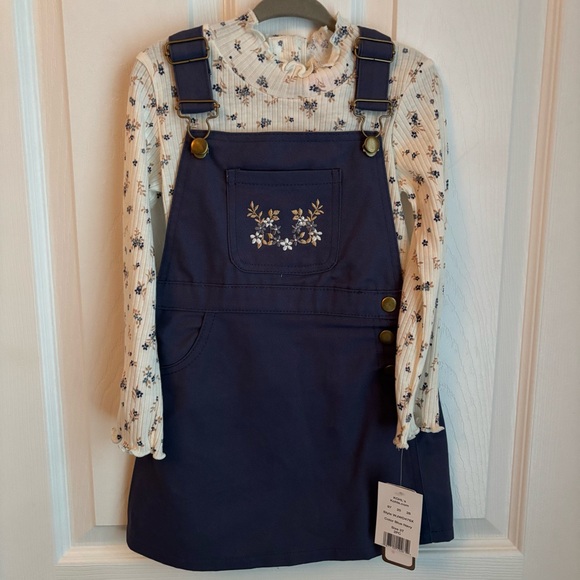 New with tags Little Lass 3T Girl Blue Floral Overall Dress Long Sleeve Tee. Comes from a non- smoking home. Tee: crewneck, long sleeve, allover floral print, ribbed knit construction. Dress: floral embellished chest pocket, adjustable straps, button closure, above the knee length.