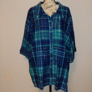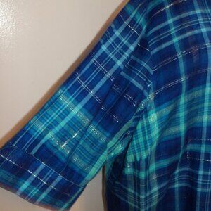 New Liz & Me Catherines Women's Plus 4X Blouse Top Blue Plaid Linen Cotton