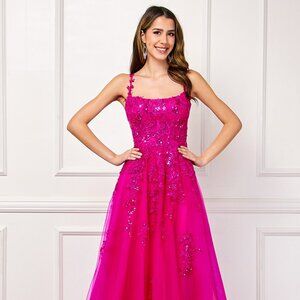 This formal sleeveless ball dress is a vision of elegance and charm, perfect for making unforgettable memories. Adorned with intricate floral embellishments, it exudes a timeless beauty, while the lace-up back adds a touch of sophistication and ensures a perfect fit.