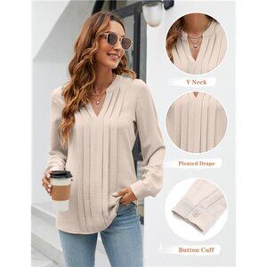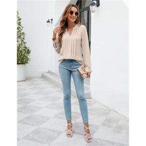 New Long Sleeve V-Neck Pleated Blouse - Dressy Casual Business Work Top, Apricot