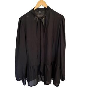 Gorgeous and flattering black blouse from New Look Curves. This piece features a feminine tie-neck detail, lightly gathered shoulders, and a flowy peplum-style hem that offers effortless style and comfort. Lightweight yet structured with long sleeves and subtle volume through the body—perfect for pairing with jeans or trousers for a polished look.