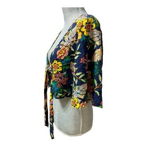 New Look Floral Tie-Front Crop Top Boho Kimono Sleeve Navy Multicolor size M