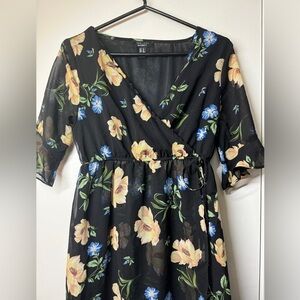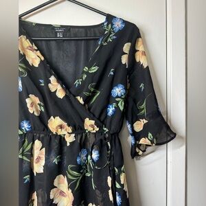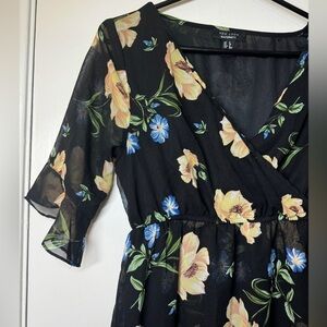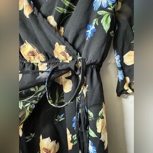 Black with a floral print in yellow, blue, and green. Surplice neckline, faux wrap, elastic waist, short sleeves with ruffled cuffs, lined. Feminine. Cocktail, wedding guest, semi formal, baby shower, etc.